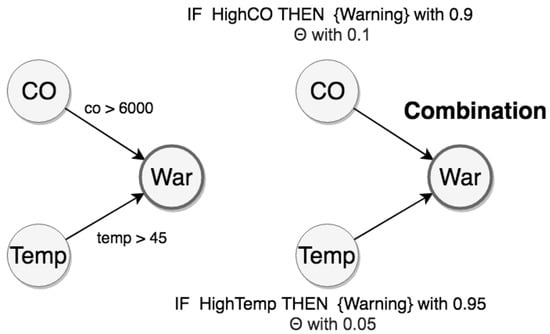 In practice, suppose an example of an IoT application. Consider a neighborhood with smart homes, each one equipped with sensors. In particular, sensors record absolute temperature values (Temp) of the house, and carbon monoxide (CO) sensors analyze the amount of CO gas in the air. Additionally, we can have a set of rules for a frame of discernment (see Figure 7).