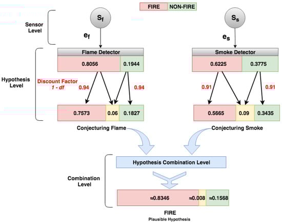 The Dempster–Shafer Theory was formally introduced by Glenn Shafer [29] based on the extension of the work by Arthur Dempster [28] and also presented as “Evidence Theory” by dealing with evidence-based hypothesis support. Pieces of evidence can be seen as events that occurred or can occur in a system. The relationship between evidence and hypothesis corresponds to a cause and consequence relationship, i.e., evidence implies a hypothesis or a set of hypotheses. The strength of an evidenced-hypothesis assignment, or the strength of that implication, may be quantified by the declaration of a person (i.e., a specialist), study, organization, or entity (data source) that provides information for a scenario [34]. According to Stephens [35], it is possible to believe in a hypothesis if it agrees with a perception. However, there may exist a distance between perceptions and reality that makes the notion of evidence, which may be strong or weak, about a specific hypothesis. According to Shafer [29], it is not expected that there is an objective relationship between an evidence and a given hypothesis that determines a precise numerical degree. Instead, by having assumed perceptions and understandings that constitute a body of evidence, a number may be announced, which represents the degree to which the evidence is believed to support a given hypothesis, hence the degree of belief that is desired to be attributed to that hypothesis.