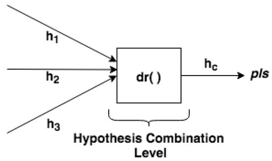 In the Hypothesis Combination Level, from a set of derived hypotheses, the Dempster combination rule is employed to calculate the most plausible hypothesis (). Optionally, another information can compose results, such as the belief function, plausibility function and belief interval. The composition of a set of DSTBBs represents an EPN (or EPN building block), as illustrated in Figure 3.