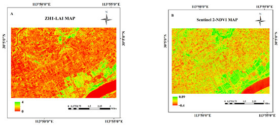 The Sentinel-2 LAI map of the study area was obtained (Figure 6C) by using the Sentinel-2 Land bio-physical processor (SL2P) within the SNAP Toolbox. The overall distribution of LAI as shown in Figure 6A,C was generally consistent, with both showing that some regions in the southeast and north have significantly higher LAI values than other regions. However, the Sentienl-2 LAI values ranged from −0.2 to 6 and ZH-1 LAI values ranged from 0 to 4, and the two LAI distributions were not quite consistent. Negative values presented in the Sentinel-2 LAI can be considered outliers. Furthermore, some studies indicated that SNAP-derived LAI may significantly overestimate LAI values for different crops [65,66]; the comparison of the ZH-1 LAI map with the Sentinel-2 LAI map also confirmed this conclusion.