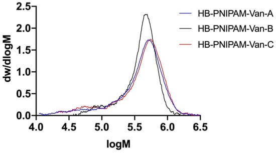 Molar mass distributions of the HB-PNIPAM-Van polymers obtained by size exclusion chromatography in methanol with refractive index and viscometric detection.