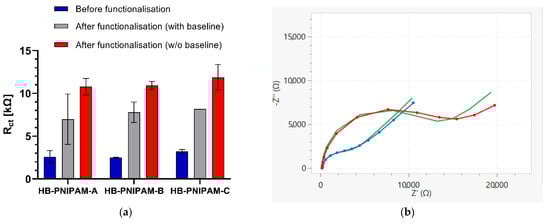 (a) Functionalization of gold screen-printed electrodes with three different types of vancomycin-modified highly branched polymers (HB-PNIPAM-A, B, C; see Table 1) shown by increased Rct values after polymer immobilization on electrodes that were tested before and after (with baseline, grey bars) and only after polymer attachment (without baseline, red bars) compared to the Rct values of bare, unmodified gold electrodes (blue bars), respectively; data are presented as mean ± standard error of the mean (SEM); n = 3. (b) EIS Nyquist plot of an unmodified, bare gold electrode (blue line + symbol) and an electrode tested after functionalization with the HB-PNIPAM-Van-C polymer without an initial baseline EIS measurement (red line + symbol); the green lines show the fitted data using the Randles equivalent circuit model.