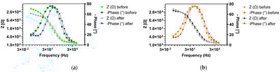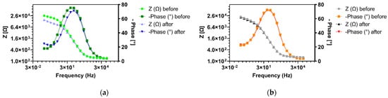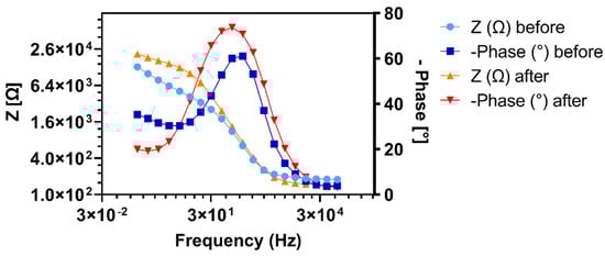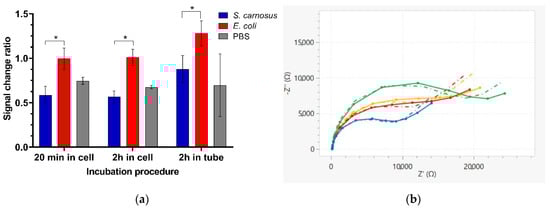 The S. carnosus binding induced coil-to-globule polymer conformation change of the immobilized HB-PNIPAM-Van-C was directly detected by a reduction in the Rct value after bacteria incubation obtained from two rapid label-free EIS measurements before and after incubation of the functionalized electrodes with the bacteria solution. The measurement time to generate an EIS Nyquist plot and thus the Rct value is only one minute, making it a rapid and simple test with much reduced test complexity compared to other existing bacteria detection diagnostic tests [,,]. For each tested procedure, the greatest reduction in Rct signal was detected after incubation with S. carnosus, as can be seen in Figure 8. In contrast, the EIS signal remained basically unchanged after incubation with the Gram-negative E. coli, which does not bind to the vancomycin residues within the highly branched polymers and therefore not induce the coil to globule transition of the polymer (Figure 8). These data demonstrate the capability of the polymer sensor to discriminate between the two different types of bacteria and thus between Gram-positive and Gram-negative bacteria. The difference between obtained signal change after incubation with the two different types of bacteria was significant in each case (20 min, * p = 0.0222; 2 h in cell, * p = 0.0206; 2 h in tube, * p = 0.0367). Multiple comparisons did not reveal a significant difference between incubation procedures for the same treatment (p > 0.05). Figure 8b and Figure 9 show exemplar Nyquist and Bode plot EIS spectra of HB-PNIPAM-Van-C functionalized electrodes before and after 2 h incubation with S. carnosus and E. coli in the measurement cell, respectively. The observed EIS signal reduction after S. carnosus confirms the hypothesis that S. carnosus binding induces a conformational change of the polymer and is in line with existing literature showing Gram-positive bacteria causing a coil-to-globule transition in these polymers induced by the vancomycin binding to the D-Ala-D-Ala peptide of peptidoglycan cell walls of Gram-positive bacteria [,,].