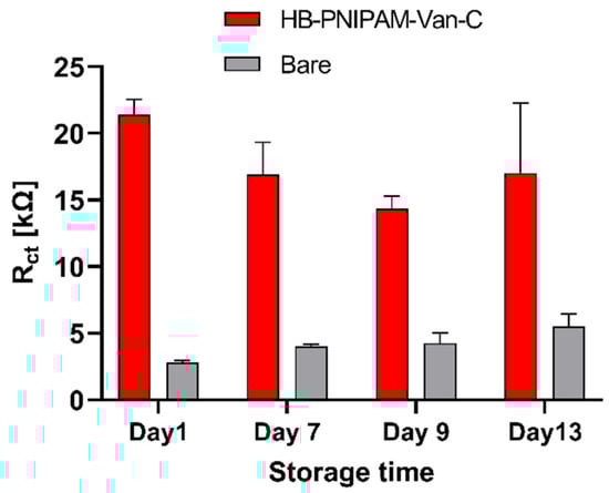 Storage stability of vancomycin-modified polymer HB-PNIPAM-Van-C functionalized electrodes demonstrated by stable Rct values detected on a single set of polymer functionalized electrodes retested four times over 13 days (red bars); a set of bare, unmodified gold electrodes was re-tested over the same period of time for comparison (grey bars); data are presented as mean ± SEM; n = 3.