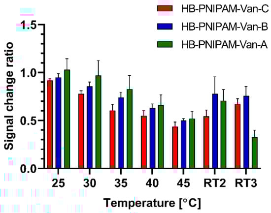 Temperature-induced Rct signal change ratios of electrodes immobilized with three different vancomycin-modified highly branched polymers tested after incubation at different temperatures with EIS measurements; the mean Rct values for each measurement are expressed as a ratio relative to the first RT measurement; data are presented as mean ± SEM; n = 4.