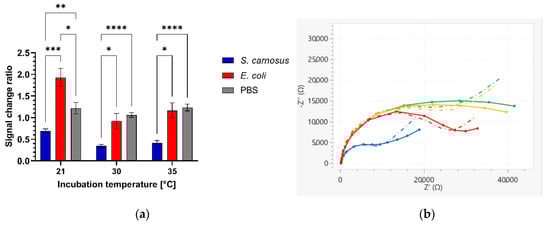 Tests were performed on electrodes functionalized with the HB-PNIPAM-Van-C highly branched polymer, before and after incubation with S. carnosus, E. coli and PBS buffer as target solutions, respectively. The functionalized electrodes were incubated with the target solution within the measurement cell at 30 °C (hotplate set at 32 °C) or 35 °C (hotplate set at 37 °C) for 20 min or 2 h. Post-incubation, the target solution was removed, and the electrode/cell was washed with EIS buffer. EIS measurements were done before and after incubation with the target solutions to compare the change in the Rct values from before to after target incubation (signal change ratio). Alternatively, after the baseline measurement, electrodes were removed from the measurement cell and incubated in a 15 mL reaction tube containing 3.5 mL of the relevant target solution (surface covered but not connectors) for 2 h at 21 °C, 30 °C or 35 °C in a thermomixer with a 15 mL tube adapter (Eppendorf, Hamburg, Germany). Electrodes were then washed in PBS and returned to measurement cells for the second measurement.
