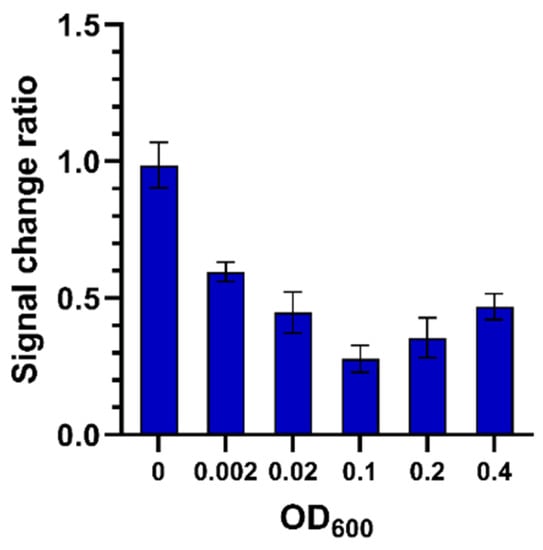 Rct signal change ratio after 2 h incubation with different concentrations of S. carnosus Gram-positive bacteria (bacterial suspensions with an OD600 of 0, 0.002, 0.02, 0.1, 0.2, 0.4 at 35 °C, respectively); data are presented as mean ± SEM; n = 4.