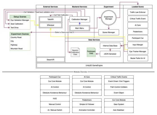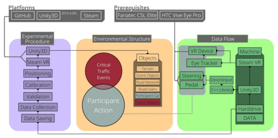 The main focus of the presented project is versatility and modularity, which allows the fast adjustment of the environmental and functional objects via prefab and the provided code in the toolkit. Research on the interactions between humans and cars is mostly done with stationary simulators. Here, a whole car chassis is used, or only the interior is set inside a multi-screen setup. However, these classical setups are often expensive, and adjustments or graphical improvements of the stimuli used in an experiment are often not possible [22]. In the past few years, there has been a significant shift in research toward virtual environments. This is reflected by applications like Cityengine and FUZOR [23,24] and by the software for driving environments [25]. Still, experimental designs on human–machine interaction, in terms of specific car interior adjustments, are not possible yet. Therefore, the presented project enables the user to create experimental conditions and stimuli freely. All functionalities that are mentioned in the following are independent and can be adjusted at will. Additionally, the presented project does not need a specific hardware setup, making it easily adaptable and future-proof. New components, e.g., new GPUs and new VR devices, can be easily integrated into the setup displayed in Figure 1. The current requirements only apply to the VR devices used and are not bound to the toolkit. The following figure depicts an overview of the default experimental procedure, environmental structure, and data flow of the toolkit. Again, all of these defaults can be adjusted at will. The configurations presented here are intended to allow for a quick adaptation to other experiments.