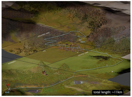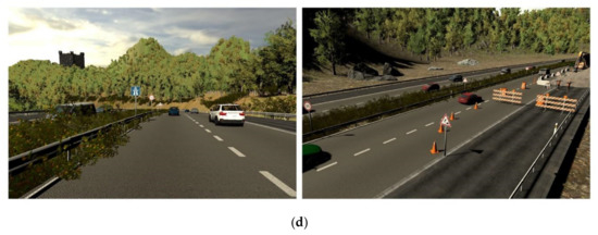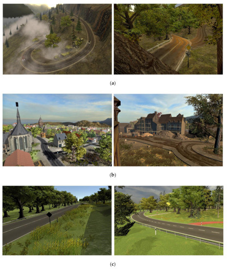OpenStreetMap is a project with the aim of creating a free map of the world. It collects the data of all commonly used terrains on maps. The project itself collects information, so the data are free of charge. The virtual environment contains a mountain road scene (see Figure 3a), including curvy roads winding through a forest and steep serpentines running down a mountain. These curvy roads require various driving speeds (from 30 km/h or slower, up to 100 km/h on straight stretches). The overall traffic density is low.