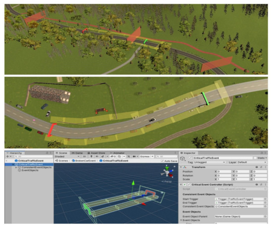 Within the event zones, dynamic objects, such as other road users, are needed to create realistic traffic scenarios. The repository presented here contains various animated pedestrians, animals, and cars to create a broad range of critical situations. Additionally, there are some busses and trucks, and some construction site vehicles that can be used. Furthermore, a user’s own fbx models, as well as vehicles from the Unity asset store, can be added. For more details, please see the Supplementary Materials. All cars used are based on the Unity wheel collider systems of the Unity3D physics engine. In the Car Core Module, user input is translated into the motor control of the participant’s car. The input consists of the motor torque, brake torque, and steering, which are applied to the wheels. This functionality is called AI control. It allows a seamless transition from automated to manual driving when activated. To facilitate realistic traffic behavior, an additional AI module enables cars to follow predefined paths. Paths followed by AI Cars and walking pedestrians were defined by mathematical Bézier curve paths [29], which were realized by the Path-creator tool [30]. Speed limit triggers inside the scene manipulate the AI’s aimed speed, handling the input propagated to the Car Core Module. Another module of the car AI allows the AI cars to keep a distance from each other. The goal is to create an easily configurable and interchangeable traffic AI for multiple study designs. With these measures, we maximized the car physics and traffic simulation realism while ensuring easy adjustments.