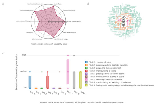 Visualization of the usability report items: (a) a radar plot of the system usability scale data; (b) a word cloud showing most frequently used words in the comments; and (c) a severity of issue bar plot, related to the tasks in the usability report. Low equals no delay in time or perceived obstacles, medium refers to a completed task with added effort. High indicates noticeable delay or frustration and that the participant may not be able to complete the task.
