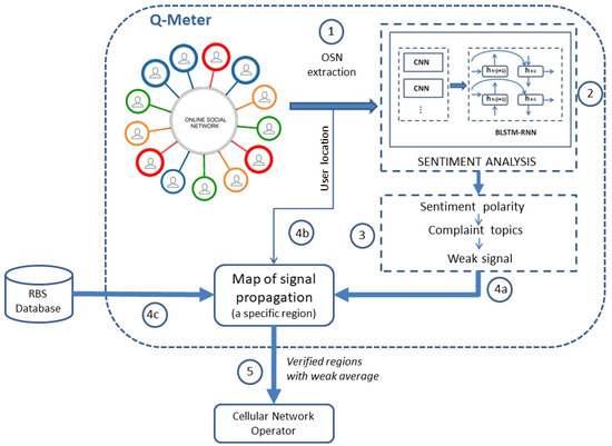 Figure 1 shows the steps for performing the measurement by proposed Q-Meter system. Sentence (1) is extracted from the OSN, and the data are used to feed the sentiment analysis algorithm (2). The sentiment analysis is performed by a deep learning model. The output of (2) is the sentiment polarity classification into positive or negative and the complaint topic classification (3) into weak signals or other topics. The weak signal complaint (4a) is sent to a map of signal propagation, which is performed by software. It is important to note that only the weak signal complaint is used in this work. However, any other complaint can be used. The weak signal complaint (4a) and the user location (4b) of the owner of the sentence are searched in radio propagation modeling software, and the RBSs are searched in a software database (4c). The output of Figure 1 is verified regions with weak averages, in which information is sent to a cellular network operator (5).