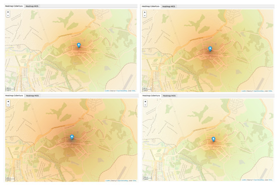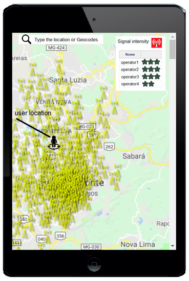 Figure 3 shows the implemented map with the RBS of a determined region, in which RBS data were extracted from the textual open database. Through the map with radio propagation modeling, it is possible to verify the signal strength of the cellular operators in the region of Belo Horizonte, Minas Gerais (MG), Brazil. Three stars in Figure 3 represent a strong signal of a determined operator, and one star represents a weak signal.