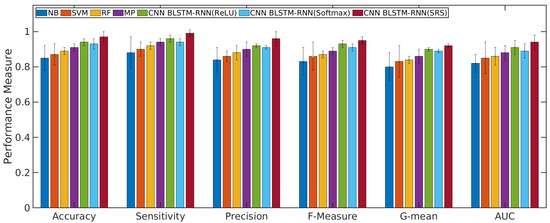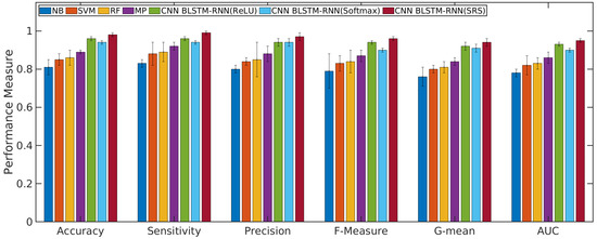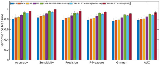 According to Figure 4 and Figure 5, the CNN with BLSTM-RNN and SRS activation function achieved the highest average accuracy for positive/negative sentences with 0.98/0.99 ± 0.01, mean ± standard deviation, sensitivity of 0.99/0.99 ± 0.01, precision of 0.97 ± 0.02/0.98 ± 0.01, F-measure of 0.96/0.97 ± 0.01, G-mean of 0.93/0.94 ± 0.02, and AUC values of 0.95/0.96 ± 0.01 for classifying the positive/negative sentences. The CNN with BLSTM and other activation functions, such as softmax and ReLU, presented better results than the other algorithms. However, they did not achieve superior results to the SRS activation function.