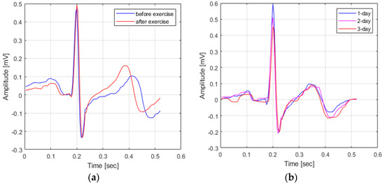Variation in ECG signals based on waveform changes. (a) Variation in ECG signals based on a change in user state (a) and Variation in ECG signals change in time (b).