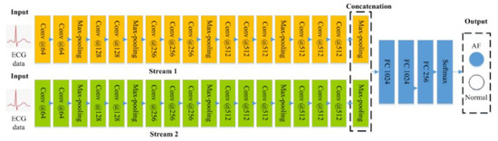 Kiranyaz et al. [17] applied a 1D CNN to ECG arrhythmia detection. Unlike the method of applying the CNN to 2D ECG images, Kiranyaz’s method showed excellent performance results by applying the CNN to 1D ECG signals. Rajpurkar et al. [18] proposed a 1D CNN model that used a deeper network and more numerous data than Kiranyaz’s CNN model. However, detection performance was low in spite of the use of more ECG data. Fan et al. [19] proposed a two layer multi scale CNN model (shown in Figure 3) to detect normal ECG signals and arrhythmia ECG signals. Its structure was designed with different filter sizes for each layer, to detect features of different data scales, and they applied a database of the ECG signal sampled at 20 s intervals. Experimental results showed that the multi scale CNN model they proposed achieved a detection result of 98.13%, which was an highly improvement upon the results of 89.58% and 98.03% achieved when a single network and the VGG network were applied, respectively.