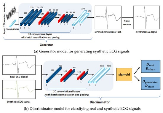 The structure of the ACGAN used in this study was designed to ensure that the generator and the discriminator have mutually different CNN models, as shown in Figure 4 [22]. To generate one-cycle ECG signals, the generator use the following input data: the class information and noise with the same size as the cycle to be generated. Data are generated in the generator model using a one-dimensional convolution operation and pooling operation repetitively and these data are used as the input data of the discriminator model along with the class information. As the number of layers increased through the repeated experiments, the generator model could not generate data similar to the real ECG signals; on the contrary, the values of generated synthetic ECG signals diverged because of the data loss in the learning process.
