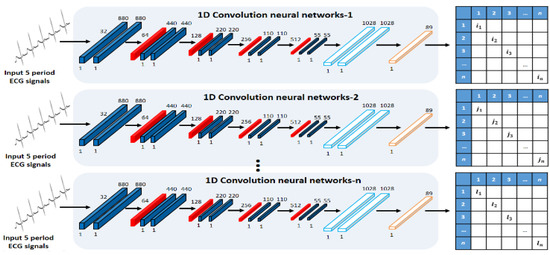 An ensemble network structure of parallel structure was designed using acquired ECG signals by user status change, as shown in Figure 5 and Figure 6. First, the real data acquired by the user status and environment changes constitute the registration database, and they are used as input data in the 1D single CNN of parallel structure. The 1D single network structure uses alternately a convolution layer that detects unique features of ECG signals and converts them into a feature map through convolution operation, a pooling layer that reduces the data size, and a dense layer that sets the inputs and size. The role of the pooling layer is to reduce the volume of calculation by reducing the size of data output from the convolution layer, and to facilitate extraction of features having robust properties [23].