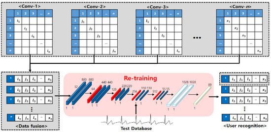 Next, the ECG signals of output results from each network are used as registration data for retraining by combining them into one database. However, when the ECG signals output from each network are all used as registration data, even the results of low recognition rates are used as registration data because of the parameters and incorrect network design; consequently, there is a problem that the recognition performance declines. Therefore, not all output data are used, and by combining the result data of the top-three networks showing excellent performance, the registration data are composed. Finally, user recognition is performed for the recomposed registration data by relearning the time-independent comparison data in the single CNN.
