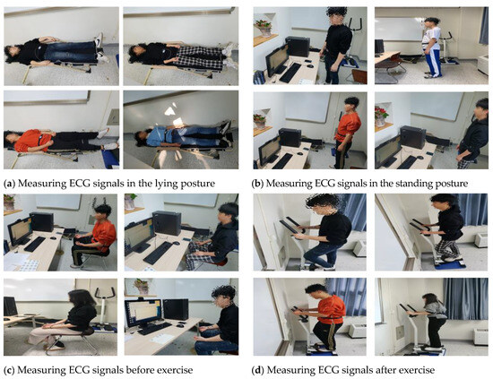 ECG signals were acquired from 89 adults of various age groups from their 20s to 50s to analyze the ECG signal changes and apply them to user recognition. The equipment used for measurement was an MP160 model (BIOPAC Systems, CA, USA) and lead-1 ECG signals were acquired by using wet electrodes. Measurements were taken over the course of one year, in order to acquire time independent ECG signals, and the ECG signals were measured by defining the following four environment as ones that could change ECG signals in real environment as show in Figure 7 [26]. Depending on the subject’s schedule, ECG signals were measured three times at a 2000 Hz sampling rate across different days.