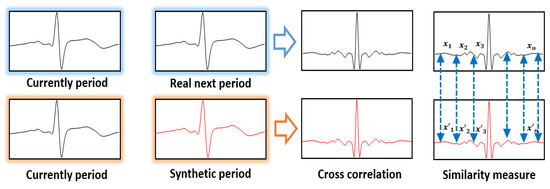 Next, the similarity results were checked using the cross correlation quantified through the correlation analysis to investigate how similar two different signals are in the signal-processing area. After overlapping the cross-correlation waveforms of the current ECG signal cycle and the synthetically generated ECG signal cycle on the cross-correlation waveforms output from the current ECG signal cycle and the next ECG signal cycle, the similarity between the two signals was expressed numerically by using the Euclidean distance. Figure 8 shows a method of measuring similarity using Euclidean distance based on cross correlation.