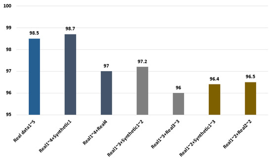 Because ECG signals of certain cycles are difficult to acquire in a real-life environment, the comparison data were constructed with various combinations of the real ECG signal cycles and the generated synthetic ECG signal cycles, as shown in Table 4. Then, they were applied to the ensemble network of parallel structure. The number of data used in the experiment was as follows: 53,400 data were used for the training data through the data expansion method with 600 data per person acquired from 89 experimentees over three times, and 17,800 data were used for the validation and comparison data.