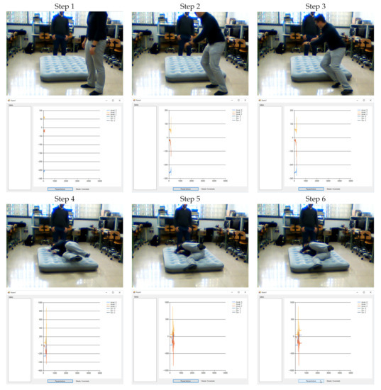 Act. 6The user trips over with the left foot.0. Standing; 1. Walk; 2. Trip over a creased carpet with the left foot; 3. Regain balance; 4. Walk; 5. Stand8