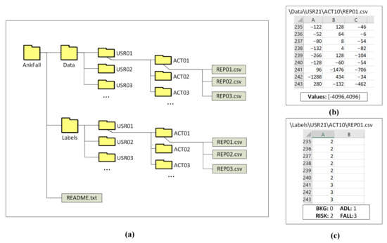 Figure 7. AnkFall internal structure: (a) Folder structure; (b) Data collected from user 21 during activity 10, repetition 1; (c) Labels for each sample of data collected during activity “(b)”.
