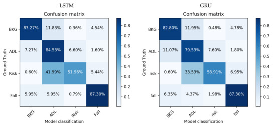 Figure 8. Confusion matrices for best LSTM and GRU models. Each specific box in the confusion matrix represents the percentage of samples of the class indicated by the row that have been classified as the class indicated in the column.