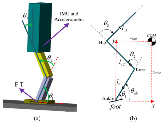 As shown in Figure 1, in practical applications, the torso of the robot was equipped with an inertial measurement unit (IMU) and accelerometer used in the simulation to measure the absolute position and posture of the robot after the foot leaves the ground. In the ankle joint, six dimensional force torque (F-T) sensors are implemented to detect the forces and torques applied to the robot. The robot consists of three links (shrunk, thigh, and torso). In the stance phase, the robot possesses three actuated joints at the ankle, knee, and hip joint, which are denoted as , , and , respectively. The absolute pitch and positions of the frame attached to the ankle joint are denoted as , , and , respectively. Although and can be considered as identical in the stance phase, they are not necessarily equal in the flight phase. Additionally, and represent the CoM’s horizontal and vertical position in global coordinates.