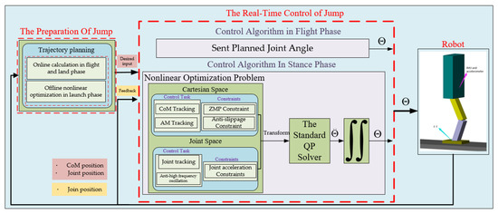 The proposed method is based on QP optimization and has good scalability. The above-mentioned restrictions, which must be considered, are unified into the proposed framework. In this paper, the trajectory optimization in the launch phase was first transcribed into an offline nonlinear optimization, and the trajectories in the flight phase and land phase were represented online using cubic polynomial interpolation. Moreover, an online QP-based framework was designed based on three-link dynamics to realize the robot’s upward jump motion, and successfully unified hard constraints such as the ZMP limitations and anti-slippage, and over-constrained tasks such as CoM, joint, and angular momentum tracking.