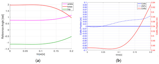 Trajectories of the joints and center of moment (CoM) in the launch phase. (a) trajectory of joints in the launch phase; (b) trajectories of CoM and zero moment point (ZMP) in the launch phase.