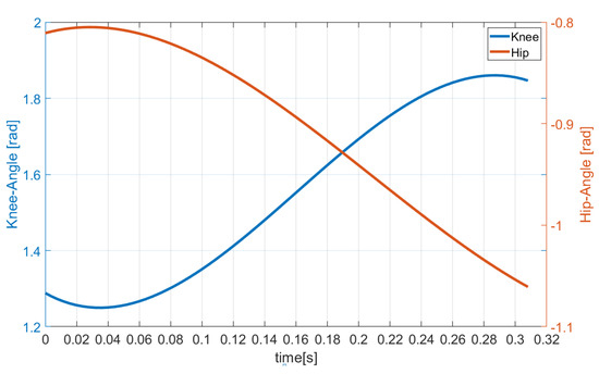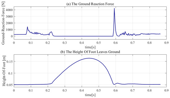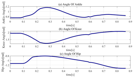 As shown in Figure 11, the joint trajectories exhibit smooth variation within the joints’ limitations, except at the initial landing phase owing to the touch-down impact. The hip, knee, and ankle have different degrees of sharp edges at the moment of touch-down. The sharp edges of the knee joint and ankle joint are larger, which demonstrates that the impact force causes more severe damage to the knee and ankle joints.