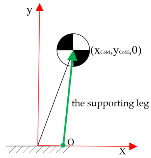 As shown in the Figure 6, the supporting leg of the inverted pendulum intersects the x-axis at the support point O, whose coordinate is , and the moment of CoM acting on the support point around the z axis is applied as follows: