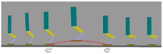 As shown in Figure 4, during the initial phase of the flight, the two actuated joints continue to stretch owing to the large velocity caused by the launch phase. Then, to ensure that the robot is not in a singular configuration and prevent the impact force from causing great damage to the robot’s mechanical structure at touchdown, the actuated joints start to accelerate in the reverse direction and slowly move to the specified position.