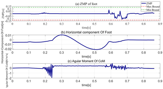 The response ZMP is illustrated in Figure 9a, the green, red, and blue plots are the upper and lower bounds of the support polygon and the ZMP plot, respectively. As can be seen, the ZMP response was always within the support polygon. Hence, it can be concluded that the robot was stable in the stance phase. Figure 9b shows the plot of the foot’s horizontal component. As can be seen, in the stance phase, the sliding of the robot’s foot was less than 0.5 cm. With regard to the touchdown impact, the movement of the foot in the horizontal component is almost negligible. Figure 9c shows that the angular momentum in the stance phase had a relatively small range, the maximum angular momentum did not exceed 2 N⋅m⋅s, and the angular momentum in the flight phase was less than 0.5 N⋅m⋅s. Therefore, it is concluded that fall and foot slippage prevention were successfully added to the constraints of the optimization problem, and the penalty function of the angular momentum was added to the cost function constraint’s angular momentum within a small range.