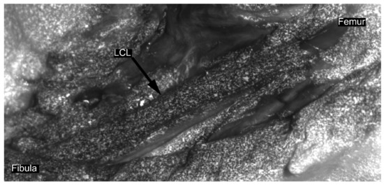 Representative speckle pattern for lateral collateral ligament prior strain computation using digital image correlation. First, diluted methylene blue was applied on the ligament to create a dark background; then, a speckle tracking was applied with white paint using an airbrush gun, following the previously published procedure [17].