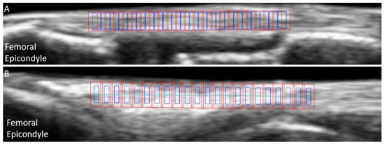 Example of initial nodes positions (cyan) overlaid on b-mode ultrasound images of the medial collateral ligament (A) and lateral collateral ligament (B), with the associated kernels (blue) and search windows (red).