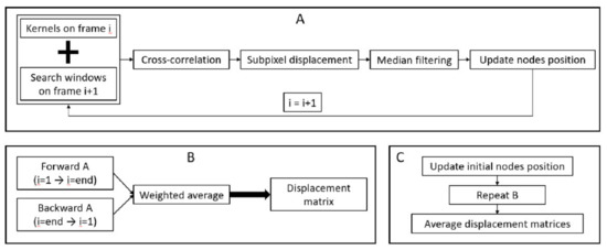 Schematic of the speckle tracking approach implemented for each trial. For each frame, the tracking of node positions is performed based on the normalized cross-correlation of the radiofrequency data (A). This tracking is performed in the forward and backward directions; after which, a weighted average is performed to obtain a displacement matrix (B). Finally, the initial nodes position is slightly modified (±0.5 mm along the x-axis of the image and ±0.5 or ±0.3 mm along the y-axis of the image for the lateral collateral ligament (LCL) and medial collateral ligament (MCL) respectively); the complete process is repeated, and all displacement matrices are averaged to obtain the final displacement matrix for the trial (C).