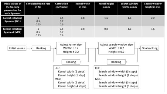 Tracking parameter values selection during optimization. Ultrasound data were first processed with initial values based on a previous study [5]. Afterwards, results were ranked, the dimensions of the kernel were modified around the best results and the ultrasound data were processed again. This processed was iterated until no improvement in the results were observed. Then, this whole iterative process was repeated similarly for the search window dimensions. Once this iterative process was over, a final ranking was performed to obtain the optimal parameter set for each ligament. fps: frames per second.
