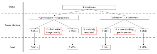 First, based on the initial image quality assessment, no LCLs were removed, and two MCLs presenting important artefacts were discarded. Second, applying the two aforementioned quantitative criteria after strain computation using optimal parameter sets, additional specimens were removed from the analyses as follows. In total, five trials with negative overall strains were found, and all belonged to a single MCL specimen from the “validation” group that was discarded. In addition, an average correlation coefficient during tracking inferior to 0.95 was observed for one MCL specimen of the “validation” group and, thus, also removed before further analyses. A flowchart of the specimen evaluation can be found in Figure 6.