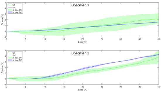 Individual load–strain curves for the two valid medial collateral ligaments from the “validation” group from 0 to 40 N. Solid lines represent the US (the green) and DIC (blue) load–strain curves. Shaded areas represent standard deviation across the trials of each specimen for US (green) and DIC (blue).