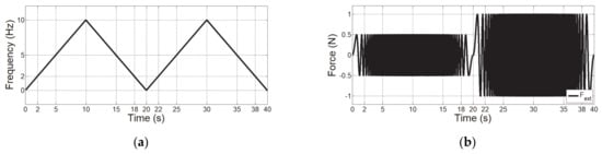 The first simulation evaluates the observer’s performance for an input signal that has various frequencies and sizes. An input signal is applied along the x axis for a frequency between 0 and 10 Hz in Figure 5a. The magnitude of the external force is set to 0.5 and 1 N, as shown in Figure 5b. A force signal is set to 16-bit resolution within ±40 N considering the performance of the analog-to-digital converter.