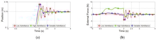 Equation (4) provides the desired acceleration according to the applied external force in Equation (3). In general, admittance control includes an inner closed-loop position controller to follow the desired position integrated by .