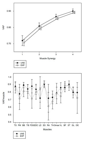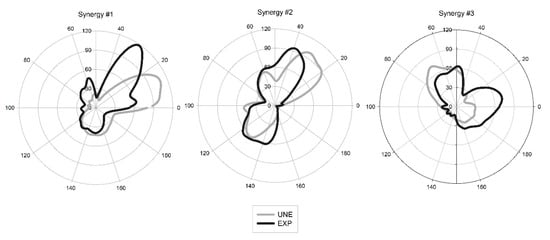Using the described criteria to identify the number of muscle synergies, three muscle synergies were identified for all participants from both UNE and EXP groups. The three-extracted muscle synergies accounted for a similar VAF between EXP (85.5 ± 0.7%) and UNE participants (86.6 ± 1.5%), as represented in Figure 1. The fourth synergy did not account for the defined 5% of VAF, accounting only 3.7 ± 0.6% for EXP and 3.4 ± 0.3% for UNE. No statistical differences were found in VAF for the three extracted muscle synergies between groups (p = 0.133; d = 0.01).