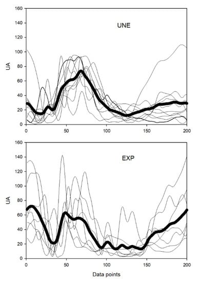 Averaged EMG envelopes (UA—arbitrary units) from 16 muscles obtained in weightlifters (EXP) and unexperienced participants during power clean cycle (200 time points).