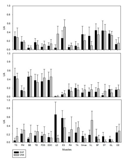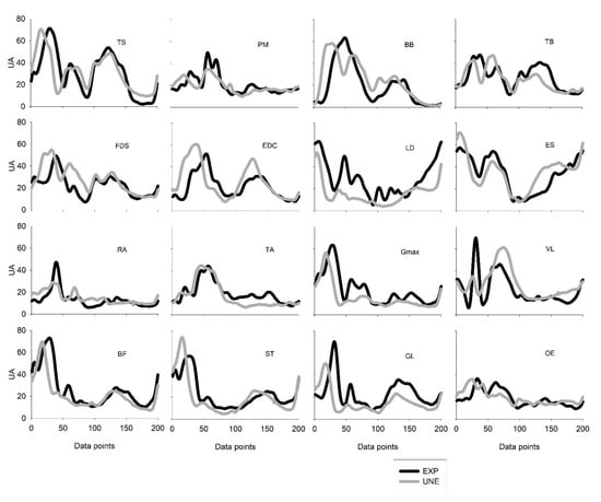 For each group, individual EMG patterns were strongly correlated (0.73 < rmax < 0.92). However, for UNE, shifts were found in PM (p = 0.03; d = −0.32) and TA (p = 0.01; d = 0.39), and for EXP, shift were found also in PM (p = 0.01; d = −0.31), EDC (p = 0.01; d = 0.39), and VL (p = 0.02; d = −0.28).
