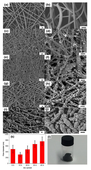 Low and high magnification SEM images of the carbon fibres treated with different levels of arc current: (a,b) 0 A (starting material; untreated lignin fibres), (c,d) 10 A, (e,f) 20 A, (g,h) 35 A, and (i,j) 45 A. All scale bars are 1 μm. (k) Average thicknesses of the fibres prepared with different levels of arc current. (l) Sample collected after arc discharge at 45 A.