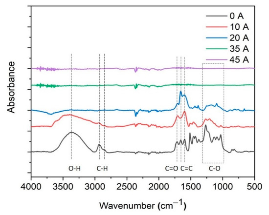 Chemical characterisation of the carbon fibres after arc discharge treatment was undertaken using FTIR (Figure 3). The spectrum of untreated lignin fibres (0 A) exhibits typical peaks corresponding to the O–H stretching at 3350–3340 cm−1 and C–H stretching in the methyl and methylene regions at around 2940 cm−1 and 2835 cm−1, respectively. A further band at around 1715 cm−1 arises from the C=O stretching in un-conjugated carbonyl/carboxyl groups [44]. The bands at 1601 cm−1 and 1512 cm−1 represent C=C aromatic ring vibrations. The peaks in the region between 1000 cm−1 and 1500 cm−1 are mainly corresponding to the C–O stretching of guaiacyl units in lignin. In the FTIR spectra of the arc discharge-treated lignin fibres, the main peaks of lignin’s functional groups become gradually weaker with increasing arc current and completely disappear in the samples treated with 35 and 45 A, indicating the full conversion of the lignin into pure carbon.
