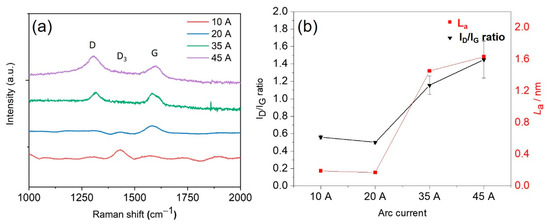 Raman spectroscopy was used to further characterise the structures of the carbonised fibres (Figure 4a). A peak, centred at 1430 cm−1 (D3 band, a feature of amorphous carbon), appeared in all samples treated with currents below 35 A [45]. The intensity decrease in the D3 band with increasingly vigorous plasma conditions confirmed the reduction in the amorphous carbon content and an increase in carbon crystallinity. The D band at 1310 cm−1 (disordered carbon structure) and the G band at 1590 cm−1 (corresponding to graphite planes) are evident for the samples treated with 35 A and 45 A. Moreover, there was a shift of the G band to higher wavenumbers, which can be attributed to an increase in the fraction of sp2-bonded carbons formed at high temperatures [45]. The intensity ratio of the D band to the G band (ID/IG) was measured to quantify the relative abundance of the various carbon forms in the as-obtained carbon fibres. As shown in Figure 4b, the ID/IG ratios clearly increase with increasing arc current, from 0.56 at 10 A to 1.45 at 45 A, which is further evidence for the transformation of amorphous carbon structures into crystalline graphitic carbon domains [20,46]. The average size of the graphite crystallites (La) has a significant positive effect on the electrical conductivities of carbon fibres [19,20], and was evaluated using Equation (2) [47],